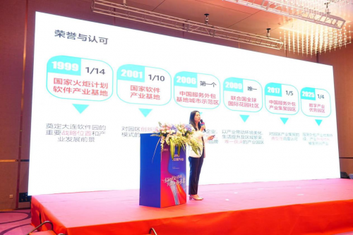 随后,大连软件园副总经理李俞详尽地介绍了大连软件园产业风貌,自1998年亿达以“官助民办”模式打造大连软件园,历经中日软件产业合作战略门户、东北亚服务外包中心、亚太软件和服务交付中心等发展的多个阶段。发展二十多年至今,大连软件园产业带整体运营面积已达120万平,累计容纳1000多家中外高科技企业,带动区域就业人口超50万,正全力打造成为全球软件服务和创新中心。