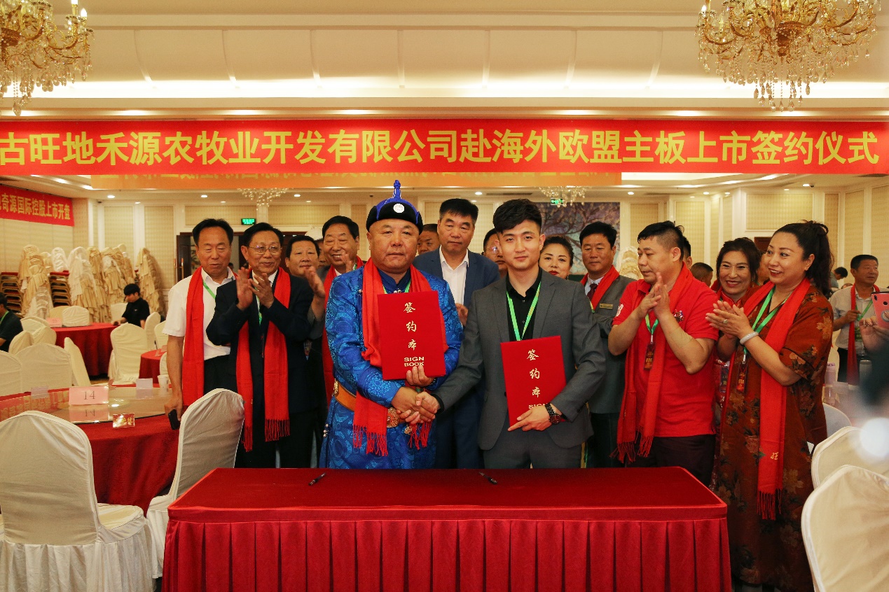 在庆典活动中,旺地奇源旗下内蒙古旺地禾源农牧业开发有限公司董事长王布仁巴图与上海楚丞保荐公司张玉龙总经理签订上市保荐协议。将在在欧盟的成长市场上市,该公司上市总股本为10个亿。