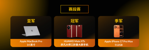 在为期两个月的常规赛段中,每个赛段的冠、亚、季军将分别获得HUAWEl Mate XTs 非凡大师三折叠大屏手机、Apple MacBook Pro 14英寸以及最新款iPhone 17 Pro Max 512GB的丰厚奖励,这既是对阶段性胜利的即时激励,也是晋级最终决战的入场券。